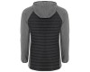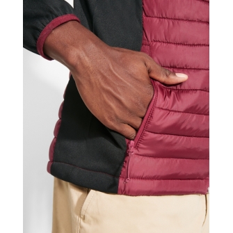 Combinado em dois tecidos. Alcochoado com enchimento “tacto de penas” na frente e costas. Soft shell nas mangas, encaixes laterais e capuz